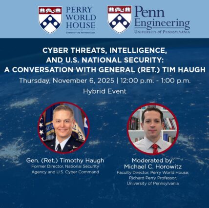 What are the largest threats the United States faces in the cyber domain, and what should it do to address those challenges? Join Perry World House and Penn Engineering for a special conversation with Gen. (Ret.) Timothy Haugh, and Former Director of the National Security Agency (NSA) and U.S. Cyber Command. Gen (Ret.) Haugh will discuss the global threat landscape, including tensions in Europe, the Indo-Pacific, and the Middle East; implications for policy makers; and impacts of rapidly changing technologies on our economy and defense. His career focused on protecting the nation from cyber threats and he has deep experience managing complicated questions surrounding intelligence and surveillance of adversaries. General Haugh served as the Director of the NSA and U.S. Cyber Command until April 2025. General Haugh was commissioned in the Air Force in 1991 and spent much of his career working on issues related to intelligence, surveillance, and reconnaissance, and then cyber security. He commanded the US Cyber National Mission Force, the 16th Air Force, and as Deputy Commander of the United States Cyber Command before becoming Director of the NSA and U.S. Cyber Command in 2024. He will be in conversation with Dr. Michael C. Horowitz, Richard Perry Professor and the Faculty Director of Perry World House.
