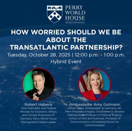 Perry World House is pleased to host a conversation with and between two eminent leaders to discuss the future of transatlantic relations. Amy Gutmann, former U.S. Ambassador to Germany, and Robert Habeck, former Vice Chancellor of Germany, will discuss whether the transatlantic partnership depends on the future of democracy and economic stability in Germany, the United States, and throughout Europe. How should the alliance deal with issues like war in Europe and the immediate threat to Ukrainian democracy and sovereignty? What is the right response to democratic backsliding in major European countries and the United States? How can leaders address economic concerns on both sides, including trade tensions between the EU and the United States? Please join us on October 28 at Perry World House for this important conversation.